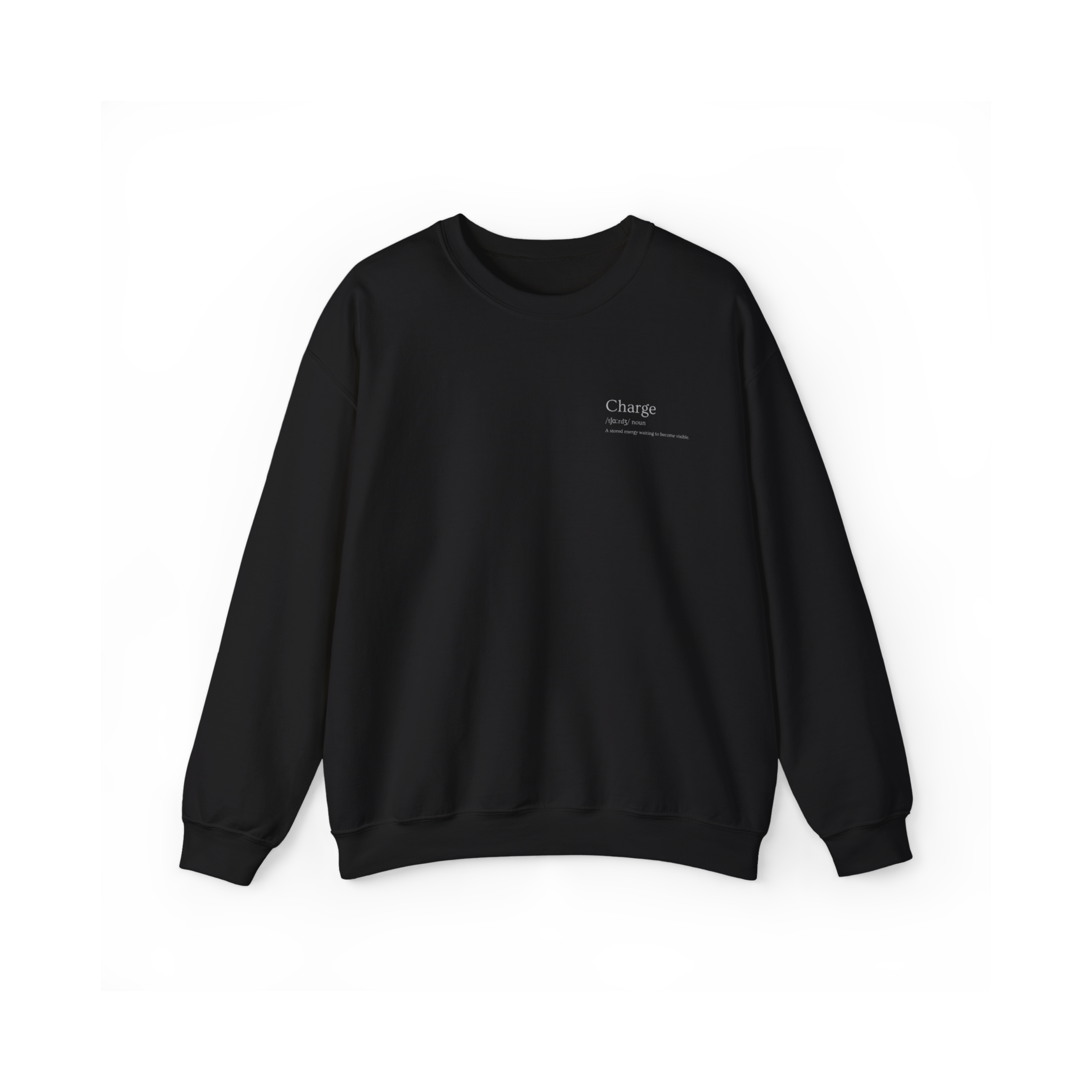 Black on black. Intention held close. A single, clinical mark on the left chest—word, sound, definition codes the tension you carry without showing it. It doesn’t ask to be noticed. It waits.